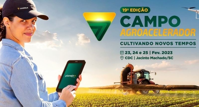O maior Dia de Campo do agronegócio do Sul de Santa Catarina, está se aproximando. A 19ª edição do Campo Agroacelerador da Cooperja, está com novidade para 2023. Agora serão três dias: 23,24 e 25 de fevereiro, e acontece em área própria da cooperativa, no CDC em Jacinto Machado/SC.