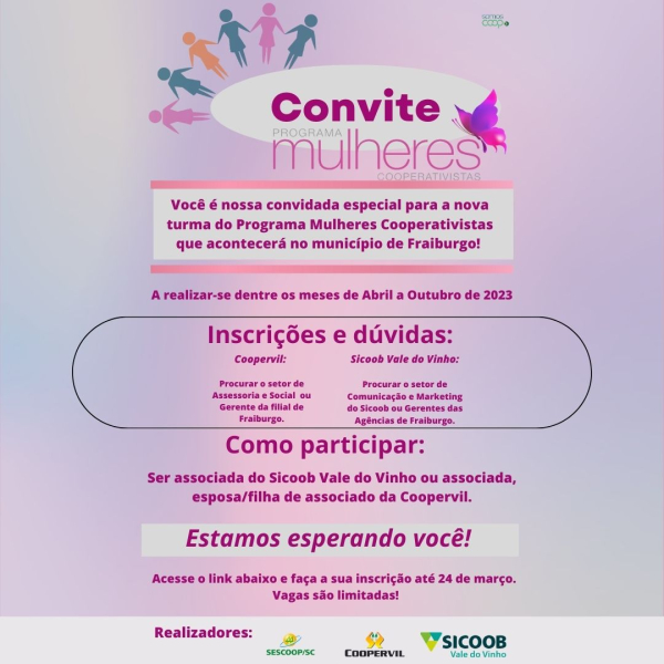 Queremos cada vez mais a participação ativa das mulheres no cooperativismo, por isso esperamos vocês no Programa Mulheres Cooperativistas! A formação acontecerá nos meses de Abril a Outubro de 2023, com encontros quinzenais.