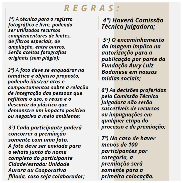 3º) As 2 fotos mais representativas e reflexivas com a campanha, por categoria, serão premiadas.