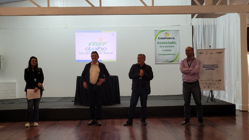 O presidente da Coopervil Luiz Vicente Suzin, o coordenador da Aurora e representante do Sebrae Joel Pinto e o médico veterinário da Aurora Marcos Lopes participaram do encerramento, assistiram um teatro feito pelos participantes mostrando cada fase do curso e após fizeram seus pronunciamentos sobre os trabalhos apresentados, qual reforçaram a importância do produtor em participar do Programa Encadeamento Produtivo oferecido pela Aurora e cooperativa filiada.