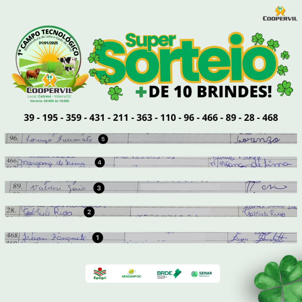 Realizamos o sorteio do 1º Campo Tecnológico COOPERVIL, no dia 31 de Janeiro de 2025 no Cetrevi às 18:00h, através do site Sorteador!