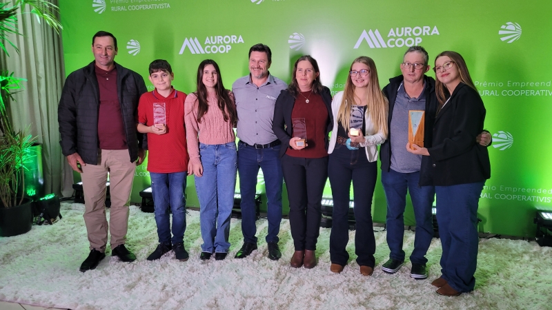O empresário rural Clodomir Piasson da comunidade de Camboim (Videira) conquistou o segundo lugar no nível Aurora Coop, qual trabalha com leite e suínos na sua empresa rural. Clodomir acompanhado pelas duas filhas que estão na propriedade destaca o orgulho de receber o reconhecimento da Aurora, qual possuem um número muito grande de integrados. Para o presidente Luiz Vicente Suzin, o reconhecimento é merecido pois a família participa das capacitações que a cooperativa oferece, e, aplica o aprendizado na propriedade, sendo que os resultados dos produtos são excelentes. Parabenizamos os três produtores finalistas e convidamos para que mais associados integrados participem dos programas que a cooperativa oferece e assim aplicá-los, para obter um bom resultado.
