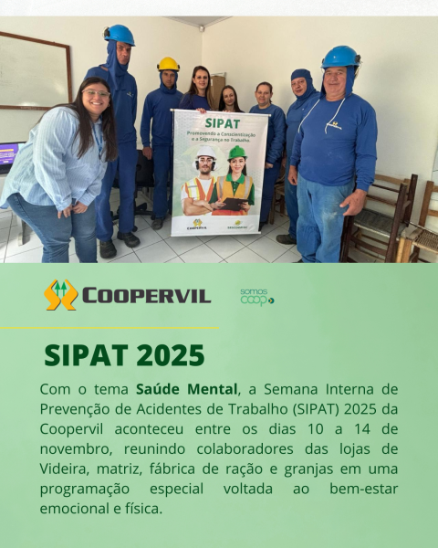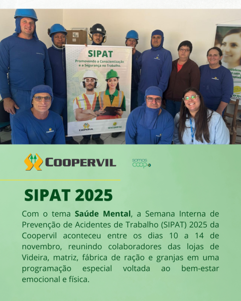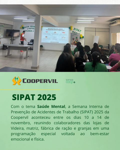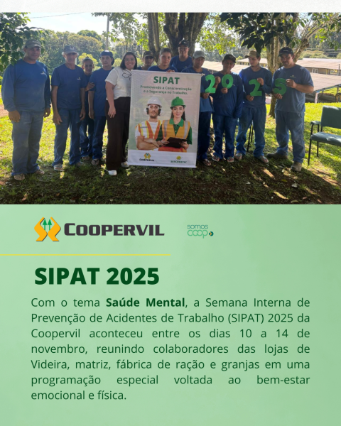 Com o tema Saúde Mental, a Semana Interna de Prevenção de Acidentes de Trabalho (SIPAT) 2025 da Coopervil aconteceu entre os dias 10 a 14 de novembro, reunindo colaboradores das lojas de Videira, matriz, fábrica de ração e granjas em uma programação especial voltada ao bem-estar emocional e física.