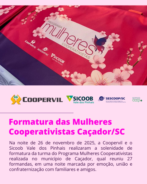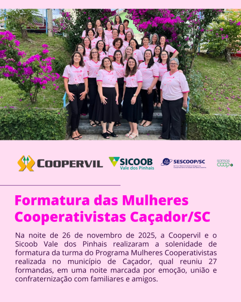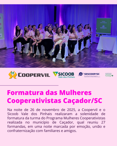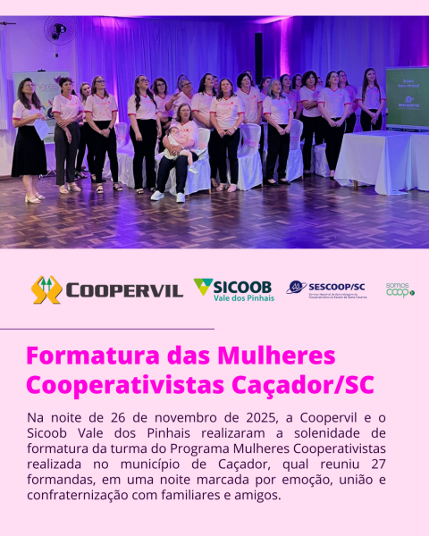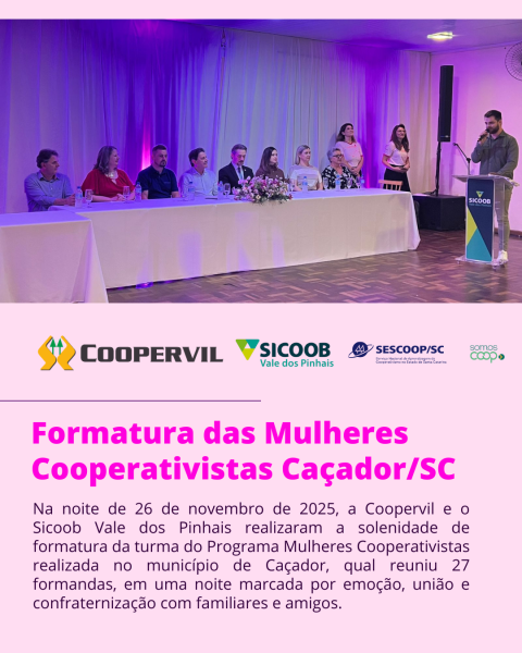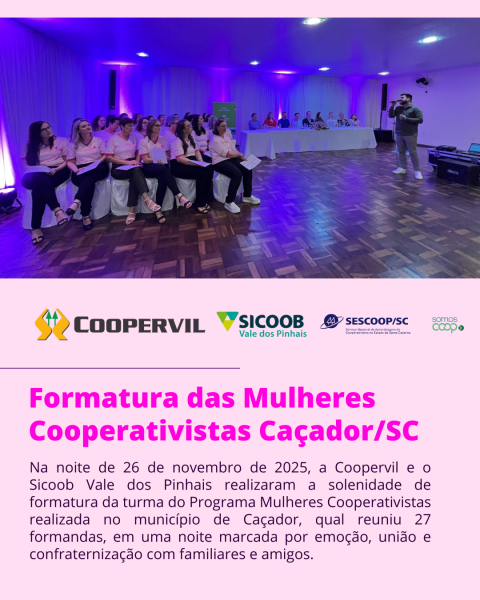 Na noite de 26 de novembro de 2025, a Coopervil e o Sicoob Vale dos Pinhais realizaram a solenidade de formatura da turma do Programa Mulheres Cooperativistas realizada no município de Caçador, qual reuniu 27 formandas, em uma noite marcada por emoção, união e confraternização com familiares e amigos.
