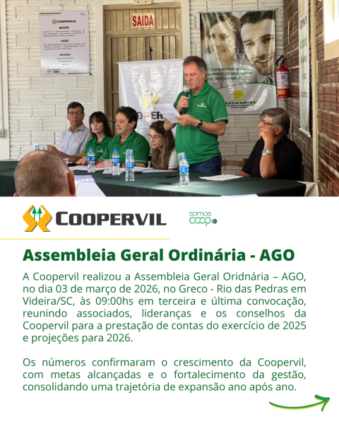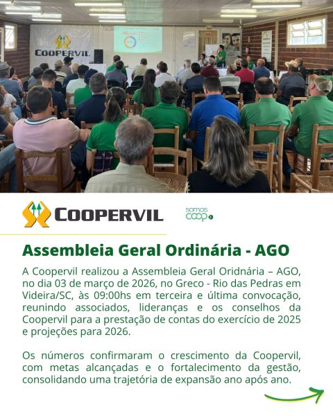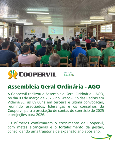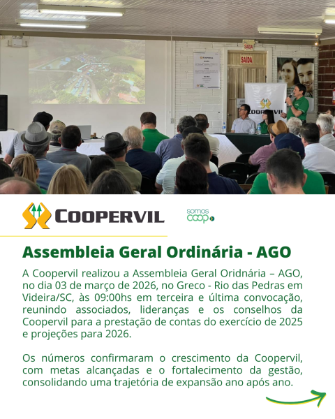 A Coopervil realizou a Assembleia Geral Oridnária – AGO, no dia 03 de março de 2026, no Greco - Rio das Pedras em Videira/SC, às 09:00hs em terceira e última convocação, reunindo associados, lideranças e os conselhos da Coopervil para a prestação de contas do exercício de 2025 e projeções para 2026.