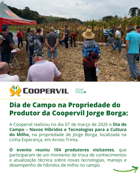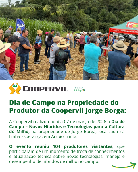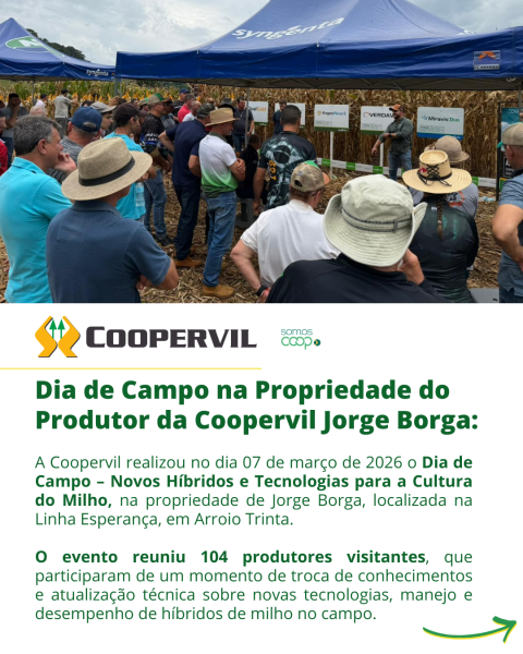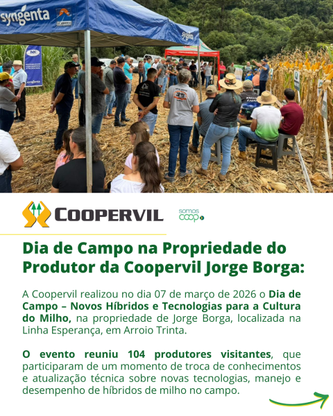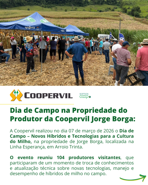 A Coopervil realizou no dia 07 de março de 2026 o Dia de Campo – Novos Híbridos e Tecnologias para a Cultura do Milho, na propriedade de Jorge Borga, localizada na Linha Esperança, em Arroio Trinta.