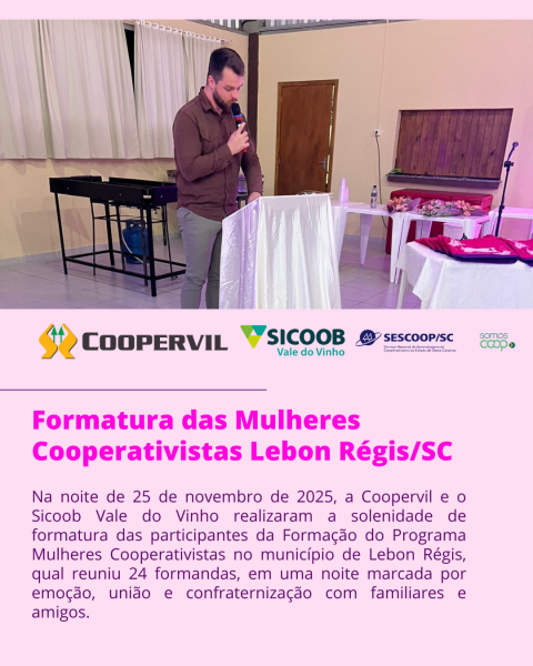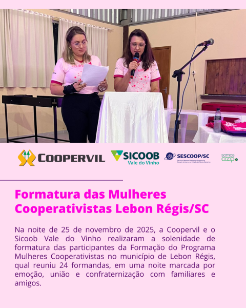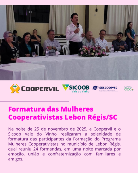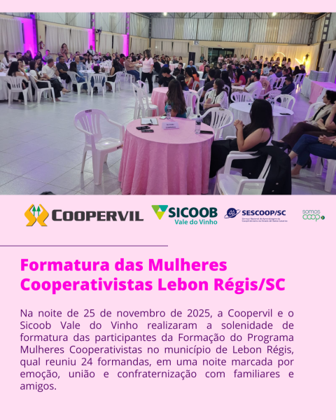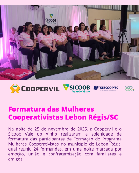 Na noite de 25 de novembro de 2025, a Coopervil e o Sicoob Vale do Vinho realizaram a solenidade de formatura das participantes da Formação do Programa Mulheres Cooperativistas no município de Lebon Régis, qual reuniu 24 formandas, em uma noite marcada por emoção, união e confraternização com familiares e amigos.