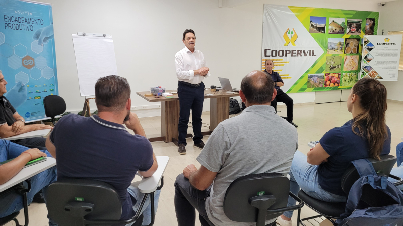 Foi realizado na sede administrativa da Coopervil no dia 14 de fevereiro de 2023, o primeiro dia da capacitação técnica do Programa Encadeamento Produtivo da Aurora Coop, com os técnicos de suínos e leite da Coopervil, ministrada pelo instrutor do Sebrae Nedir Paulo Alixandre, contando com a presença do presidente da Coopervil Luiz Vicente Suzin e do coordenador dos Programas de Qualidade da Aurora Coop Joel Pinto.