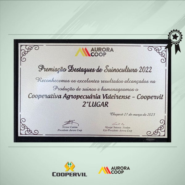 A Aurora Coop realizou na última terça-feira, 21 de março a premiação “Destaques na Produção de Suinocultura Aurora 2022”, qual a Cooperativa Agropecuária Videirense – COOPERVIL, foi marcada com uma grande conquista, o 2º lugar da categoria cooperativa filiada Aurora Coop, recebendo o troféu referente a excelência no trabalho realizado pela cooperativa no ano de 2022.