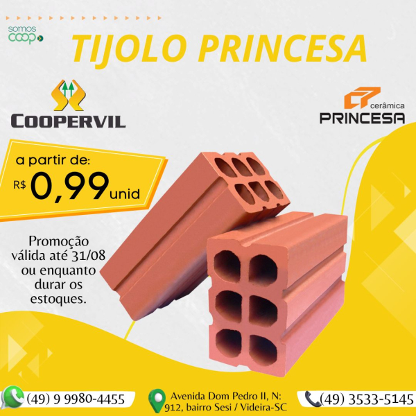 Na loja de Materiais de Construção da Coopervil você encontra Tijolo Princesa a partir de R$ 0,99 a unidade.