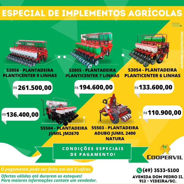 Condições e preços especiais na linha de Plantadeiras, onde você pode estar efetuando o pagamento em até 3 safras.