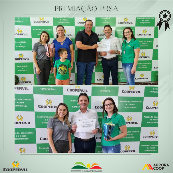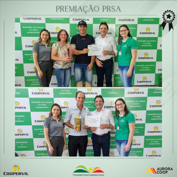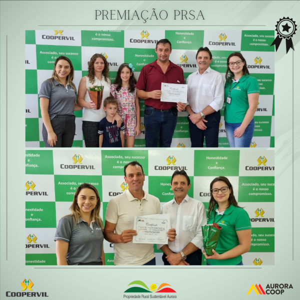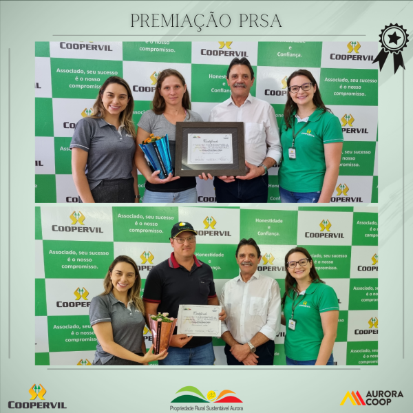 O ato de premiação foi conduzido pela coordenadora social Suzana Araldi e a entrega foi realizada pelo presidente Luiz Vicente Suzin, pela coordenadora do PRSA na Coopervil Ligiane Carinhato e pela representante da Aurora a supervisora Maiquieli Deon representando o coordenador do PRSA da Aurora Coop, Sandro Luiz Tremea, sendo que os produtores receberam a certificação, brindes e valores conforme o desempenho e atendimento aos critérios.