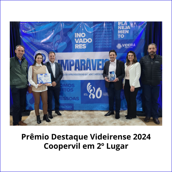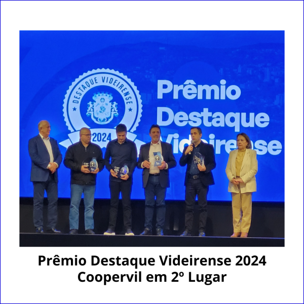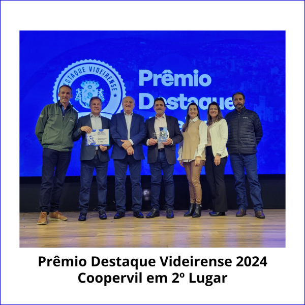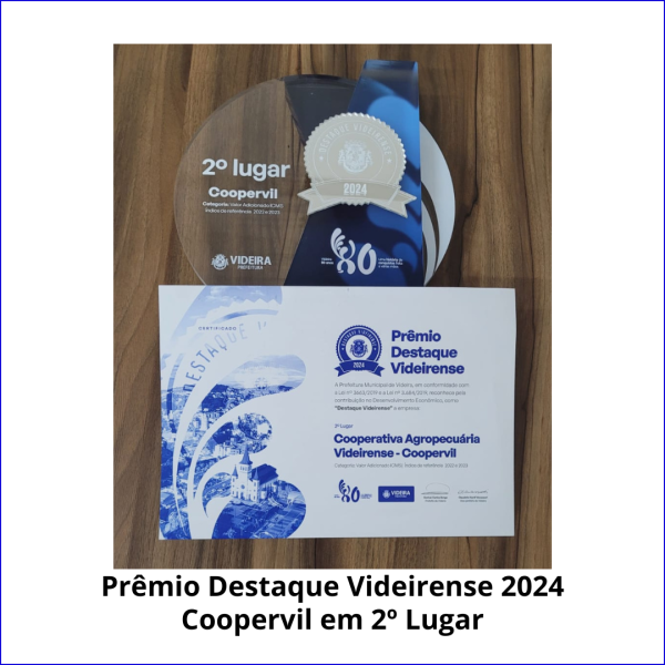 A Cooperativa Agropecuária Videirense – COOPERVIL foi reconhecida na noite da quinta-feira dia 18 de julho de 2024 na solenidade do PRÊMIO DESTAQUE VIDEIRENSE 2024, realizado pela Prefeitura Municipal de Videira, na categoria Valor Adicionado de ICMS Índice de referência aos anos de 2022 e 2023, sendo que a COOPERVIL foi reconhecida com o 2º lugar pela contribuição no Desenvolvimento Econômico.