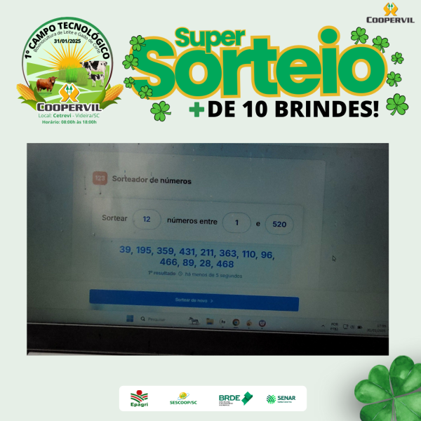 Realizamos o sorteio do 1º Campo Tecnológico COOPERVIL, no dia 31 de Janeiro de 2025 no Cetrevi às 18:00h, através do site Sorteador!
