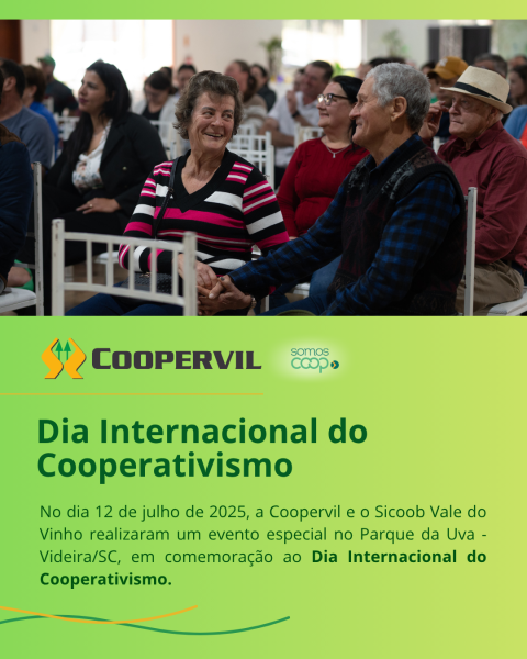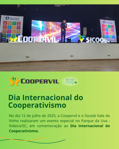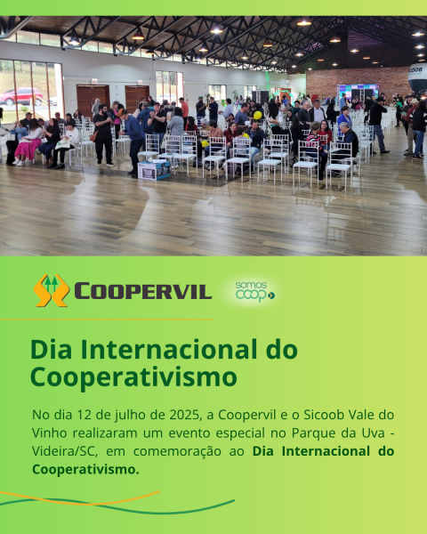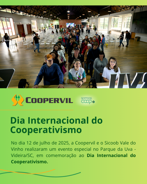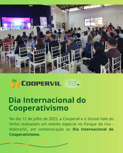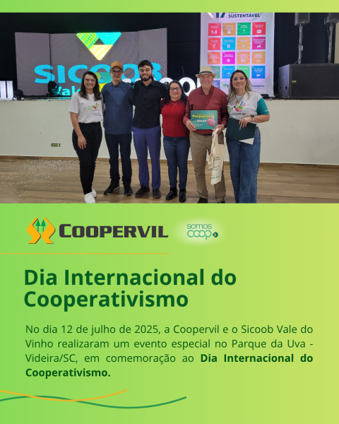 No dia 12 de julho de 2025, a Coopervil e o Sicoob Vale do Vinho realizaram um evento especial no Parque da Uva - Videira/SC, em comemoração ao Dia Internacional do Cooperativismo. A celebração contou com o apoio do Sescoop SC, qual reuniu associados, colaboradores e a comunidade em um momento de reflexão, aprendizado e valorização dos princípios cooperativistas.