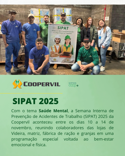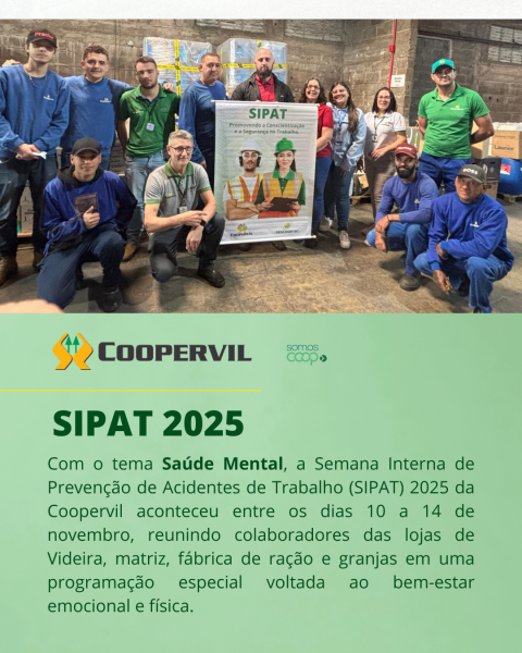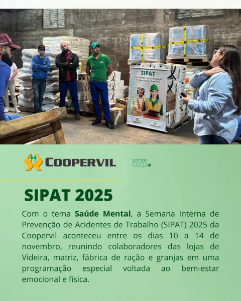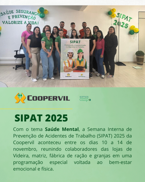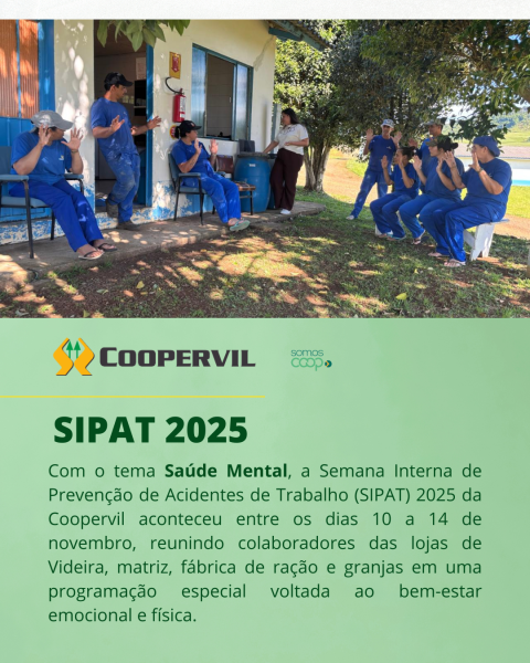 Com o tema Saúde Mental, a Semana Interna de Prevenção de Acidentes de Trabalho (SIPAT) 2025 da Coopervil aconteceu entre os dias 10 a 14 de novembro, reunindo colaboradores das lojas de Videira, matriz, fábrica de ração e granjas em uma programação especial voltada ao bem-estar emocional e física.