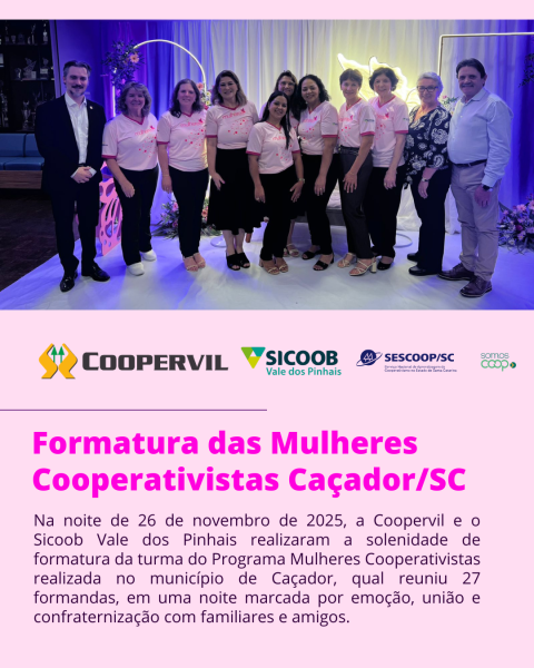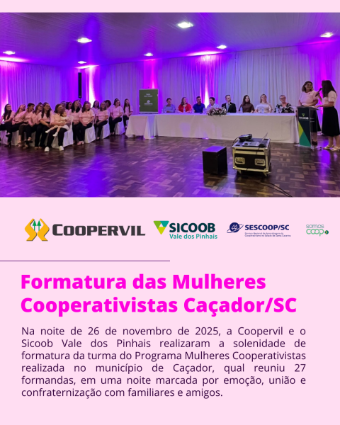 Na noite de 26 de novembro de 2025, a Coopervil e o Sicoob Vale dos Pinhais realizaram a solenidade de formatura da turma do Programa Mulheres Cooperativistas realizada no município de Caçador, qual reuniu 27 formandas, em uma noite marcada por emoção, união e confraternização com familiares e amigos.