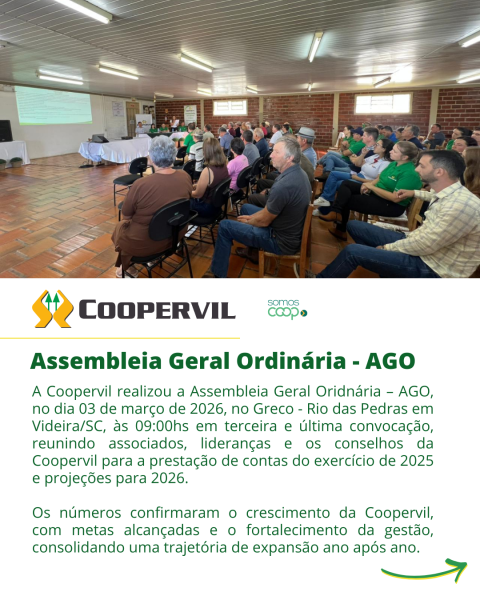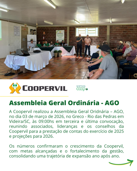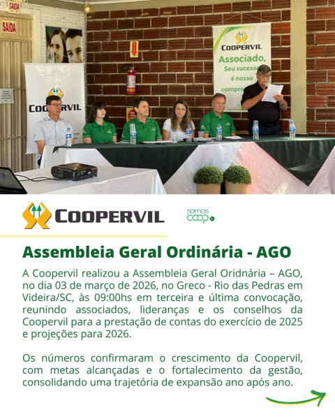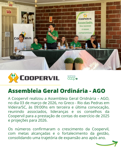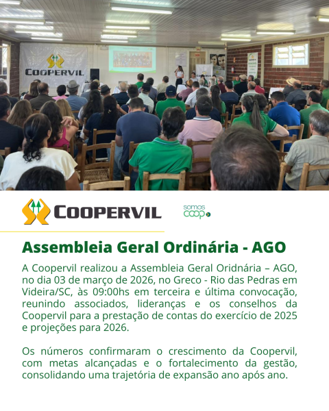 A Coopervil realizou a Assembleia Geral Oridnária – AGO, no dia 03 de março de 2026, no Greco - Rio das Pedras em Videira/SC, às 09:00hs em terceira e última convocação, reunindo associados, lideranças e os conselhos da Coopervil para a prestação de contas do exercício de 2025 e projeções para 2026.