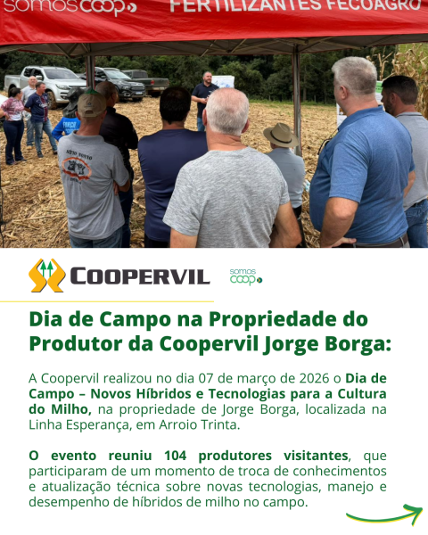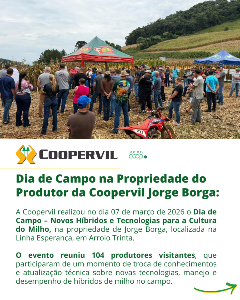 A Coopervil realizou no dia 07 de março de 2026 o Dia de Campo – Novos Híbridos e Tecnologias para a Cultura do Milho, na propriedade de Jorge Borga, localizada na Linha Esperança, em Arroio Trinta.