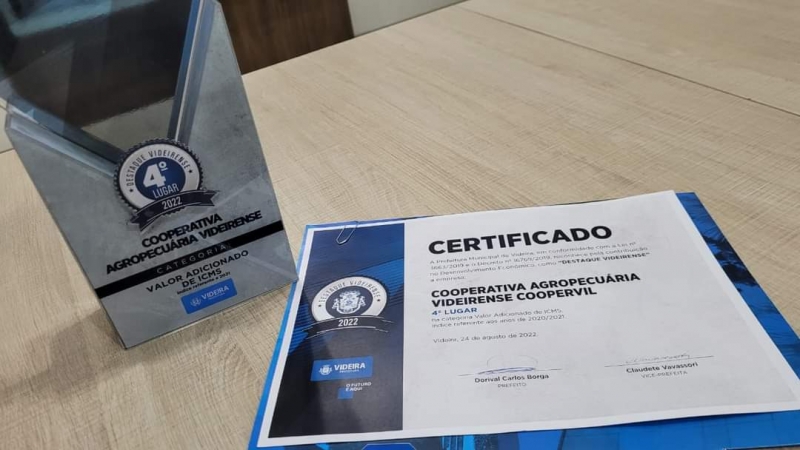 A COOPERVIL foi representada pelo coordenador João Novello que na ocasião também representava o presidente Luiz Vicente Suzin e foi certificada com o 4° LUGAR na categoria Valor Adicionado de ICMS, índice referente aos anos de 2020 e 2021.