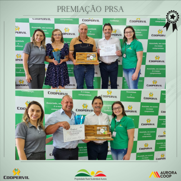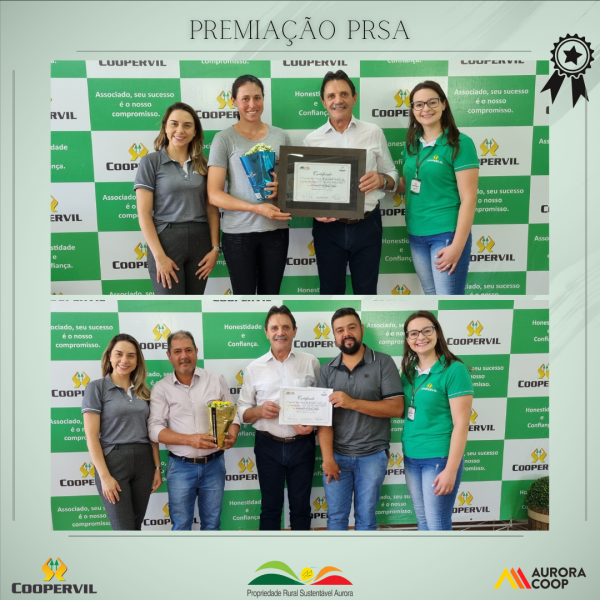 A Coopervil e seus associados participam do PRSA desde sua implantação em 2016, iniciando com 03 produtores e a cada ano vem evoluindo o número de propriedades, sendo que em 2023 foram 21 propriedades certificadas, recebendo um valor considerado da Aurora Coop, que soma com a evolução da mesma agregando qualidade aos seus produtos e se destacando cada vez mais no cenário da agricultura. Parabéns aos produtores que alcançaram esse sucesso.